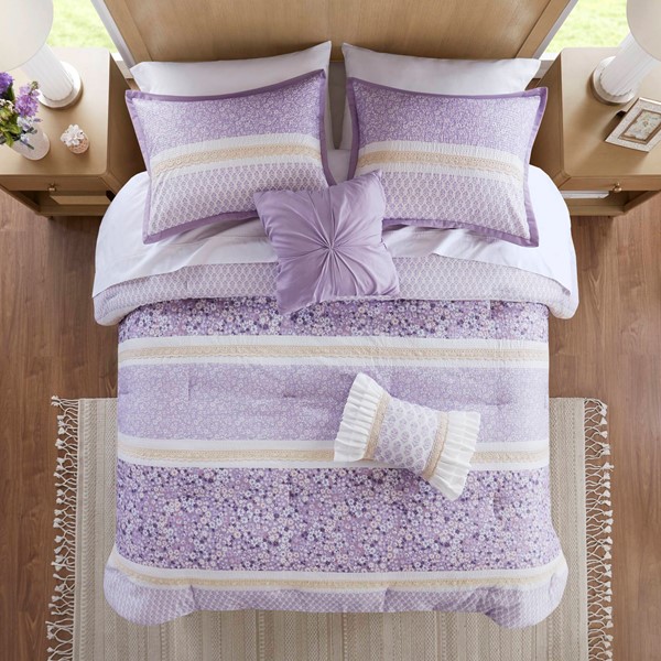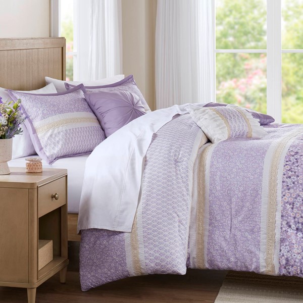 Featuring three different floral and botanical print designs separated by lace trims, this seersucker microfiber comforter set exudes shabby chic/farmhouse style that adds a touch of elegance to any bedroom. The two decorative pillows feature gathered fabric and embroidery with lace trim and ruffles, adding to the overall charm of the set. Colors featured in this set include various shade of purples, yellows, and whites. The comforter and pillows are filled with hypoallergenic polyester filling that is treated to be dustproof, ensuring a restful and comfortable sleeping experience. This machine washable bedding set features an antimicrobial treatment, which inhibits bacteria growth and keeps the bedding fresher for longer.