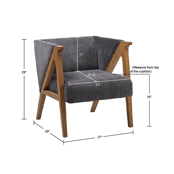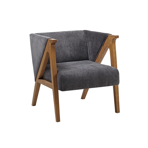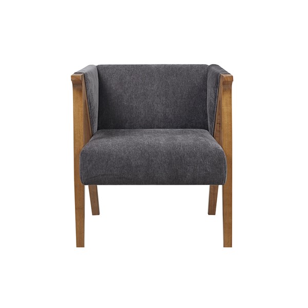 Update your living room with the stylized design of the Madison Park Carla Accent Chair. This lounge chair is upholstered in a soft, charcoal black chenille fabric that is complemented by the elm finish on the solid wood frame, for a transitional look. The low back, track arms, and angular design of the frame create a unique silhouette to elevate your home decor. Assembly is required.