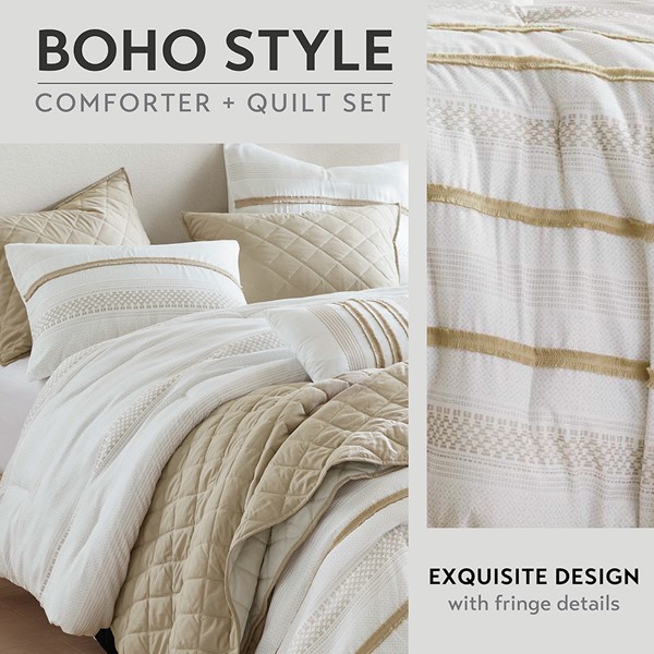 The Madison Park Carolina 7 Piece Stripe Comforter/Quilt Set is made of 100% polyester microfiber. This taupe and white bedding set features a variety of color-blocked stripe prints and exquisite trim, perfectly combining modern style with coastal boho flair. This Full/Queen comforter/quilt set includes a comforter, a coverlet, two standard shams, two quilted shams, and a decorative pillow. The naturally wrinkle and shrinkage-resistant fabric ensures lasting beauty and easy maintenance, offering all-season comfort and a chic update to your bedroom decor.