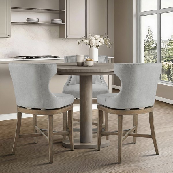 Define your dining area with the elegance of the Madison Park Carson Counter Stool with Swivel Seat. This pholstered wingback style counter chair features clean lines and curve, for a sophisticated silhouette. A bronze kick plate protects the footrest from every day wear and tear, while the swivel function allows you to easily rotate the seat. The straight rubber wood legs feature a smooth reclaimed grey wood finishes that complements the upholstery to create a beautiful transitional look in your dining room. Assembly is required. Max weight capacity: 300 lbs.