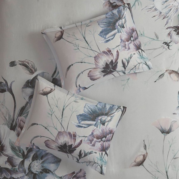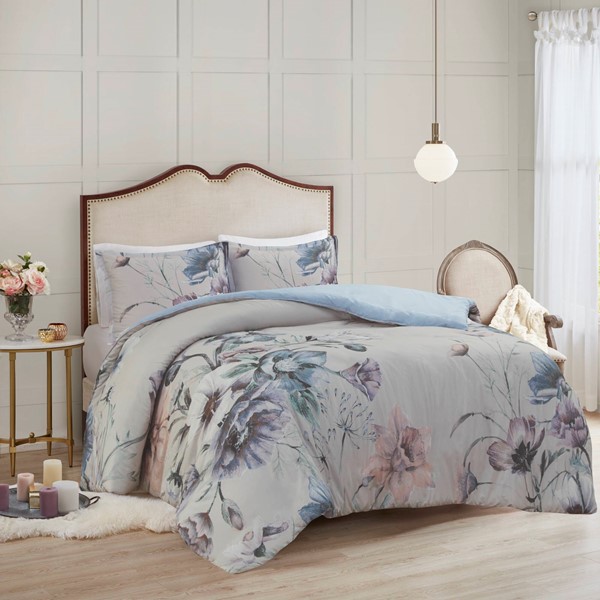 The Madison Park Cassandra 3 Piece Cotton Printed Duvet Cover Set offers a beautiful shabby chic update to your bedroom. The cotton duvet cover and shams feature a large floral print, in soft blue hues, creating a gorgeous look. With its romantic color combination, this shabby chic duvet cover set set brings a soft allure to your bedroom. A button closure helps secure a comforter insert within the duvet cover and four corner ties help prevent it from shifting (insert is NOT included). This bedding set is also OEKO-TEX certified, meaning it does not contain any harmful substances or chemicals to ensure quality comfort and wellness.