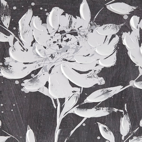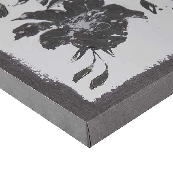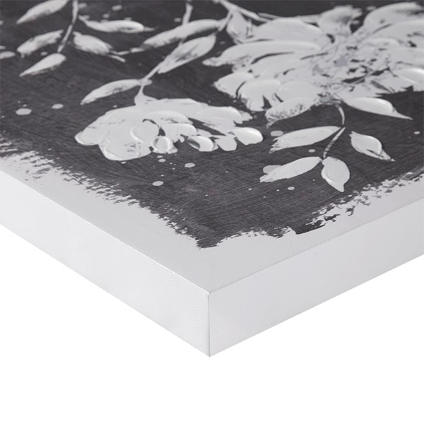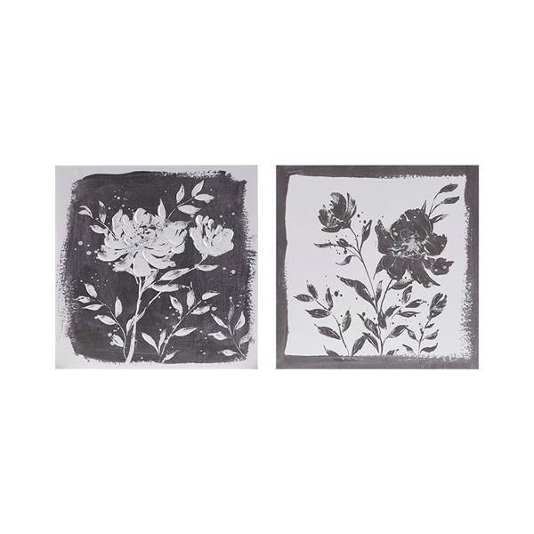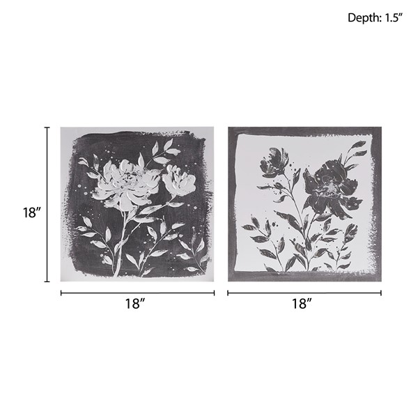 Add a modern update to your space with the Madison Park Cassia Embellished Floral 2-piece Canvas Wall Art Set. The wall art set features beautiful flowers in a soft black and white hue for a bold contrast touch, while the unique border retro design creates a frame like look and feel. The hand embellishments add rich texture and dimension, while a sawtooth hanger on the reverse top frame for easy hanging. Simply display both 18×18" pieces together over a console or bench for a great focus piece or hang separately to add a cohesive aesthetic throughout your living spaces.