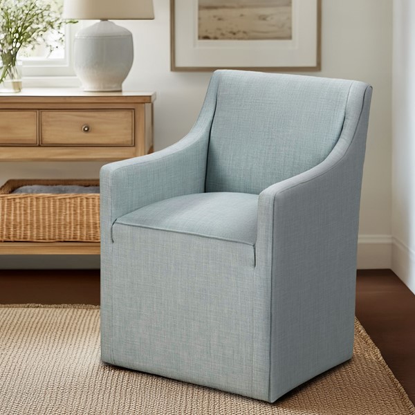 The Madison Park Charlotte Dining Chair blends timeless elegance with modern functionality. Designed to mimic the classic slipcovered look without the upkeep, this fully upholstered chair features clean lines, soft curves, and tailored detailing. Hidden rubberized casters provide smooth mobility, while the fully padded back, seat, and arms, along with a sinuous spring system, ensure superior comfort. A dual-layer foam cushion and sturdy plywood and solid wood frame offer lasting support. Perfect for modern, transitional, and classic spaces. Upgrade your dining room today!