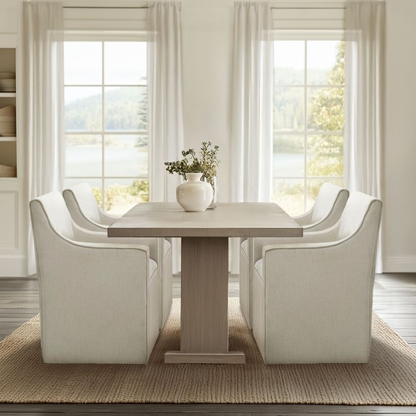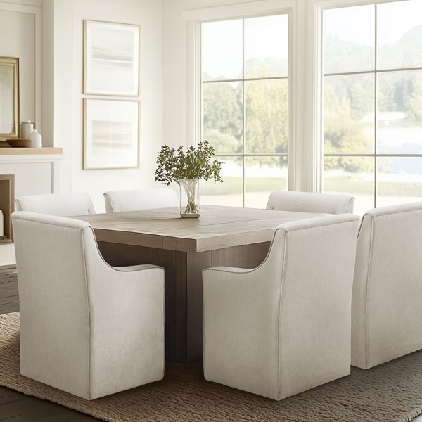 The Madison Park Charlotte Dining Chair blends timeless elegance with modern functionality. Designed to mimic the classic slipcovered look without the upkeep, this fully upholstered chair features clean lines, soft curves, and tailored detailing. Hidden rubberized casters provide smooth mobility, while the fully padded back, seat, and arms, along with a sinuous spring system, ensure superior comfort. A dual-layer foam cushion and sturdy plywood and solid wood frame offer lasting support. Perfect for modern, transitional, and classic spaces. Upgrade your dining room today!