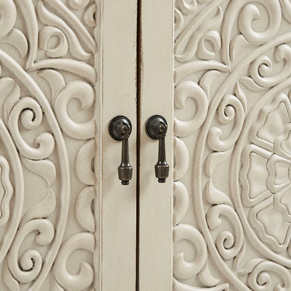 Update your home with the refined charm of the Madison Park Cowly Accent Chest. A reclaimed walnut finish adorns the wood frame and legs of this accent chest, while antique cream doors with intricate detailing create a rich contrasting look. Magnetic door catches secure each door and shelved cabinet provides plenty of storage space for your home essentials. This accent chest pairs beautifully with most decors to complete your space. Leg assembly required.