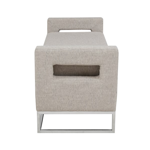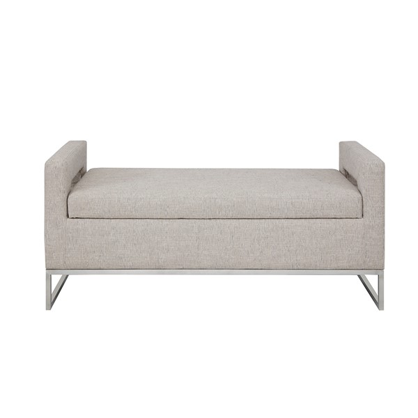 The Madison Park Crawford Storage Bench offers the perfect blend of style and functionality. This bench features open sides upholstered in a soft grey fabric and straight metal legs with a brushed silver electroplate finish, for a chic transitional look. The attached cushion on the rectangular seat provides exceptional comfort and opens up to an ample space to store your blankets and other essential items. Perfect for your living room, bedroom, or entryway, this upholstered storage bench beautifully complements any decor. Leg assembly required. Max weight capacity: 400 lbs