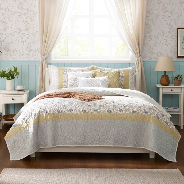 The Madison Park Dawn 6 Piece Cotton Percale Reversible Quilt Set offers a shabby chic update to your bedroom decor. A paisley print is featured on the cotton quilt with pintucked fabric separated by lace taping embellishments. Matching shams mirror the design of the quilt, while three decorative pillows and a solid bedskirt complete this reversible farmhouse quilt set. This bedding set is also OEKO-TEX certified, meaning it does not contain any harmful substances or chemicals to ensure quality comfort and wellness. A coordinating shower curtain is available and sold separately. Items in the set may come in a rolled or compressed packaging, which will need to be fluffed up or steam ironed before use to remove wrinkles.