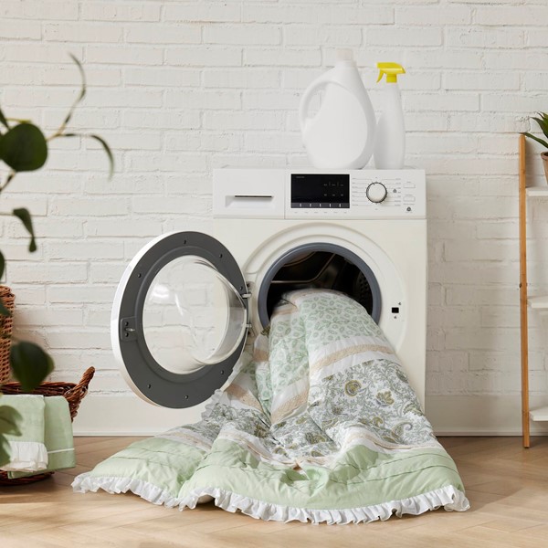 The Madison Park 9-Piece Comforter Set showcases a floral print on cotton percale, enhanced by cottage-inspired details like pintucking, lace taping, and a ruched flange.