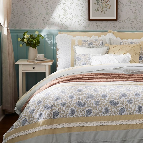The Madison Park Dawn 9 Piece Cotton Percale Comforter Set offers a shabby chic update to your bedroom decor. A paisley print is featured on the cotton comforter with pintucked fabric separated by lace taping embellishments. Around the edge, a ruched flange adds a graceful touch, for a charming cottage look. Matching shams mirror the design of the comforter, while two solid Euro shams complement the top of the bed. Three decorative pillows and a solid bedskirt complete this farmhouse comforter set. This bedding set is also OEKO-TEX certified, meaning it does not contain any harmful substances or chemicals to ensure quality comfort and wellness. A coordinating shower curtain is available and sold separately. Items in the set may come in a rolled or compressed packaging, which will need to be fluffed up or steam ironed before use to remove wrinkles.
