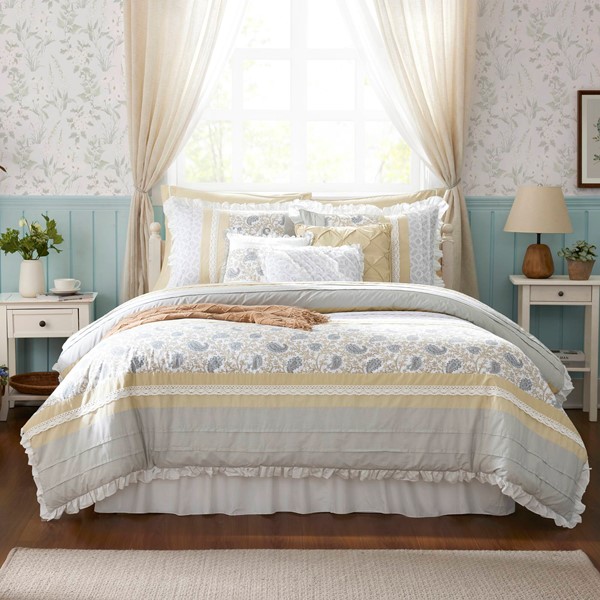 The Madison Park Dawn 9 Piece Cotton Percale Comforter Set offers a shabby chic update to your bedroom decor. A paisley print is featured on the cotton comforter with pintucked fabric separated by lace taping embellishments. Around the edge, a ruched flange adds a graceful touch, for a charming cottage look. Matching shams mirror the design of the comforter, while two solid Euro shams complement the top of the bed. Three decorative pillows and a solid bedskirt complete this farmhouse comforter set. This bedding set is also OEKO-TEX certified, meaning it does not contain any harmful substances or chemicals to ensure quality comfort and wellness. A coordinating shower curtain is available and sold separately. Items in the set may come in a rolled or compressed packaging, which will need to be fluffed up or steam ironed before use to remove wrinkles.
