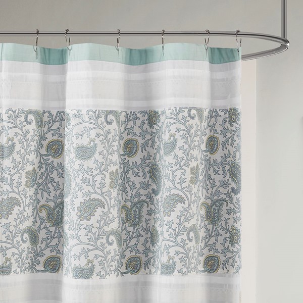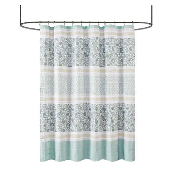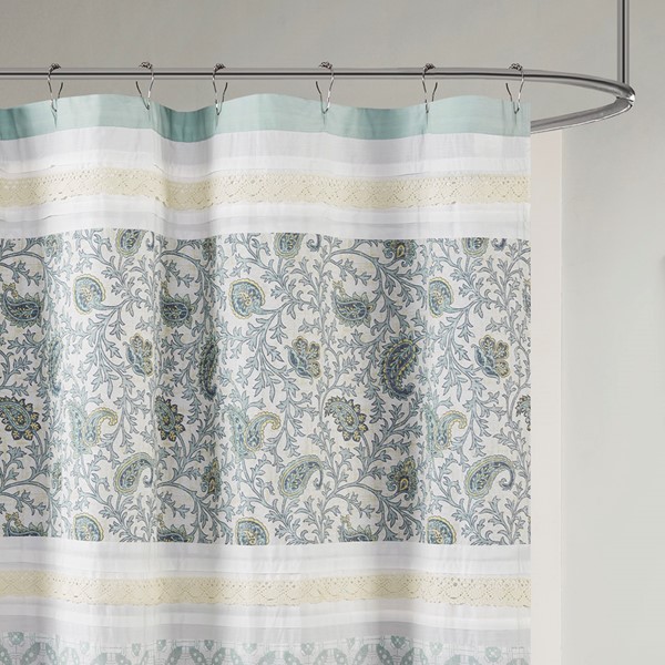For a charming and stylish touch to your bathroom, our Madison Park Dawn cotton shower curtain holds all of the perfect elements to do shabby chic the right way. A mixture of soft aqua, periwinkle, and hints of green are printed in a paisley design alongside pin tucked white fabric that is separated by beautiful lace taping. Finished with 12 button holes at the top makes this shower curtain easy to assemble hooks and simply hang on any standard rod (hooks and rod not included). This shower curtain is also OEKO-TEX certified, meaning it does not contain any harmful substances or chemicals, ensuring quality comfort and wellness. Each shower curtain measures 72×72″ and is machine washable for easy care; to keep this shower curtain in the best condition a water repellant liner is highly recommended (liner not included and should be purchase separately).