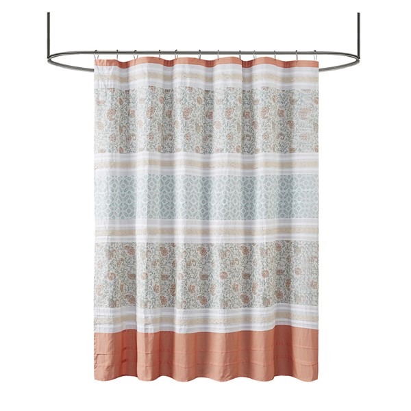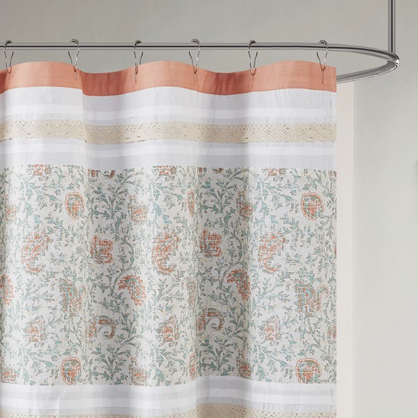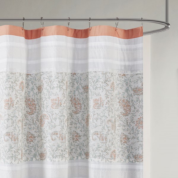 For a charming and stylish touch to your bathroom, our Madison Park Dawn cotton shower curtain holds all of the perfect elements to do shabby chic the right way. A mixture of coral, orange, and hints of green are printed in a paisley design alongside pin tucked white fabric that is separated by beautiful lace taping. Finished with 12 button holes at the top makes this shower curtain easy to assemble hooks and simply hang on any standard rod (hooks and rod not included). This shower curtain is also OEKO-TEX certified, meaning it does not contain any harmful substances or chemicals, ensuring quality comfort and wellness. Each shower curtain measures 72×72″ and is machine washable for easy care; to keep this shower curtain in the best condition a water repellant liner is highly recommended (liner not included and should be purchase separately).