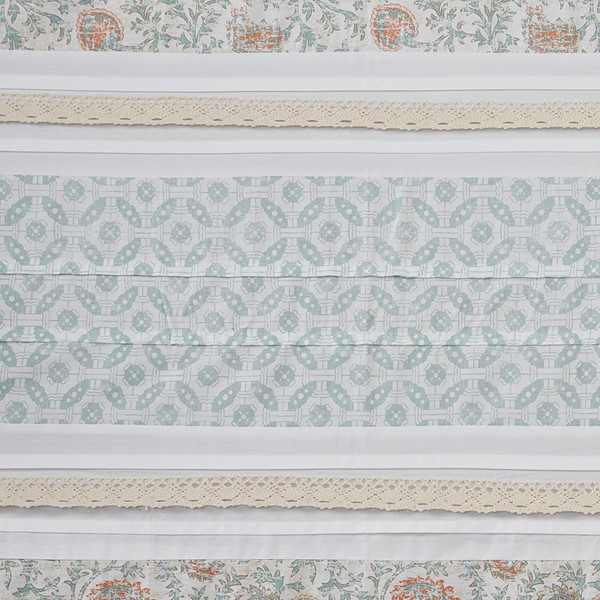 This product is like a breath of fresh air with its muted colors that give off a cozy, washed-out vibe. The seafoam green, dusky blue, mint, and yellow accents, along with the tan lace trim, create a playful mix of colors and prints without being overwhelming. I’m absolutely loving it!