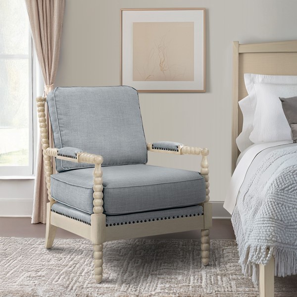 Elevate your space with the Madison Park Donohue Wooden Armchair, a perfect blend of classic charm and modern comfort. Featuring an open-back spindle design with turned wood detailing, this accent chair with arms exudes timeless appeal. The tightly woven fabric upholstery enhances durability while resisting pilling, and the plush multi-layered foam seat ensures lasting support. Padded arms add extra comfort, while bronze nailhead trim lends a refined touch. A versatile accent chair for living rooms, bedrooms, or reading nooks. Complete your space with this timeless accent chair today!