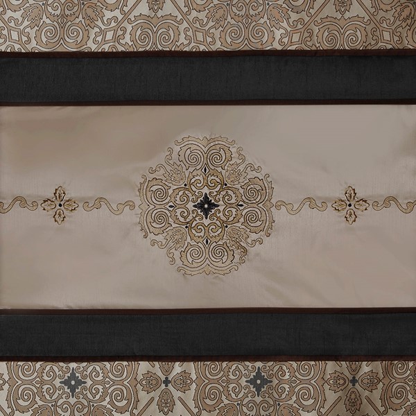 Add a touch of sophistication and elegance to your bathroom with the Donovan shower curtain. This stunning curtain features a bold color-blocked design that is accentuated with intricate embroidery details. The jacquard weave adds depth and texture to the curtain, showcasing a beautiful medallion pattern that gives an entirely new look to your bathroom decor. This collection also features coordinating bedding that is sold separately, allowing you to create a cohesive and stylish look throughout your entire bedroom and bathroom.