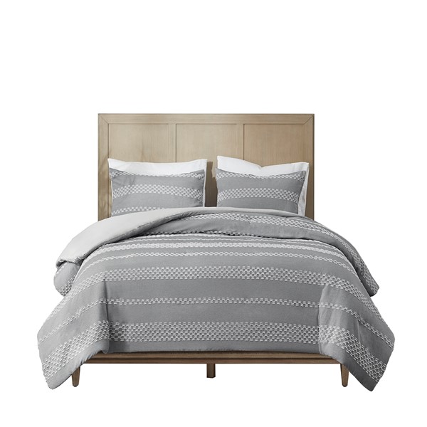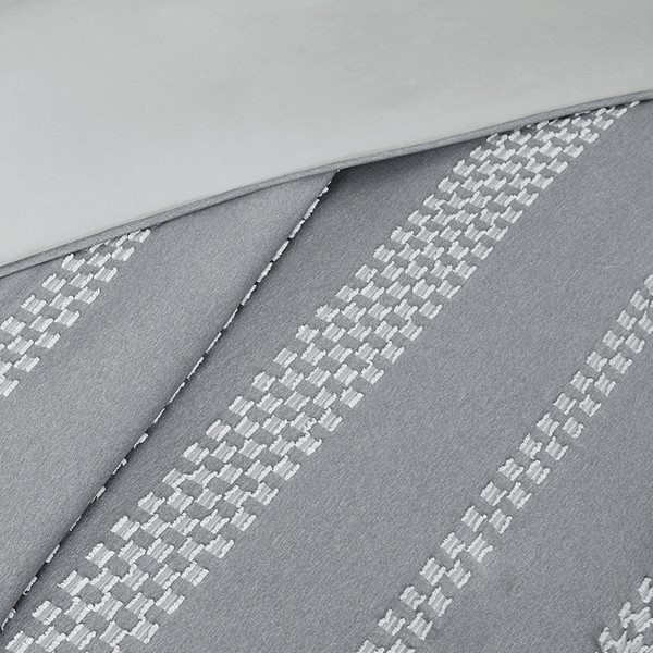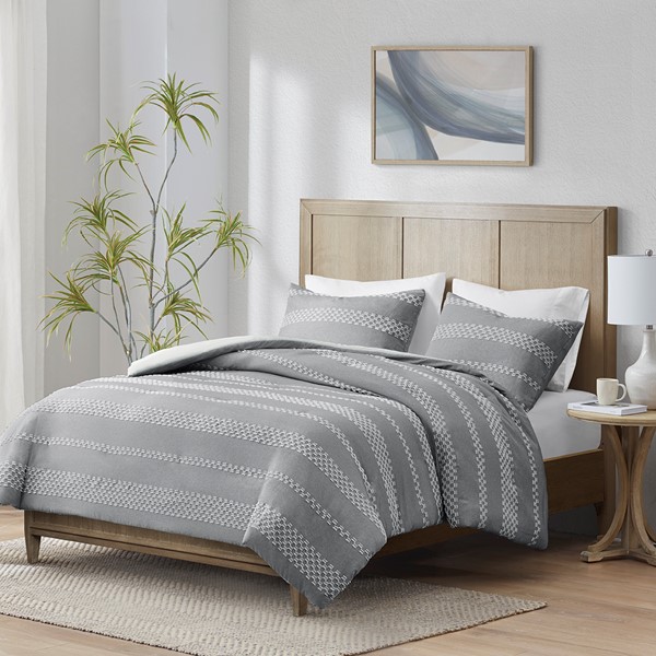 Artistically designed, this striped duvet cover set revitalizes your bed with bold style and refined comfort. The duvet cover features a gray and white clipped jacquard stripe design with a solid light gray reverse to create texture and dimension. Handsomely tailored matching shams provide the finishing touches to this expertly crafted casual bedding set.