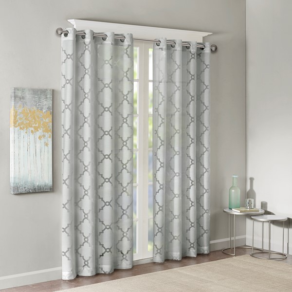 Stylish yet delicate, the Madison Park Eden Fretwork Sheer Curtain will update and soften any room. The lightweight sheer fabric features a burnout fretwork design on a grey ground, for a dimensional and airy look. Finished with a grommet top detail making it easier to hang, open, and close panels throughout the day. Fits up to 1.25" diameter rod.