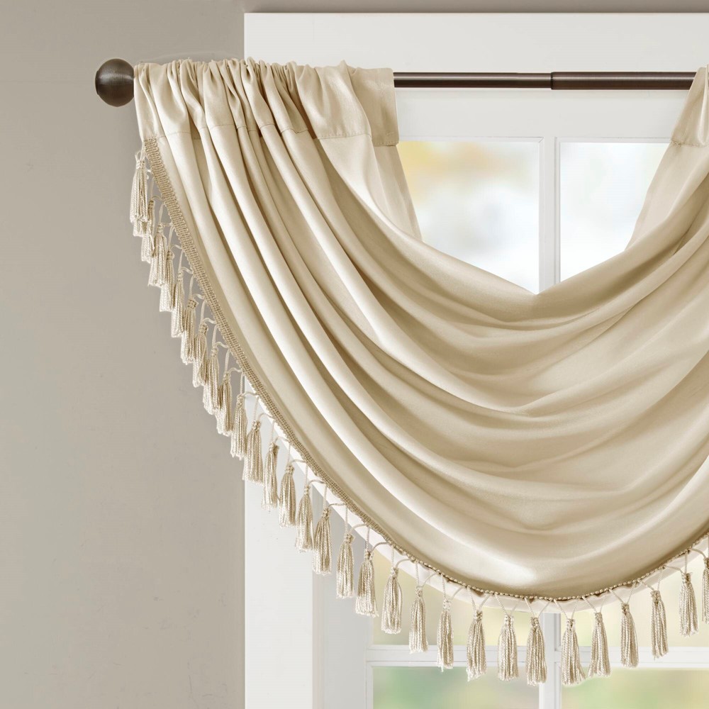 Bring style and sophistication to your windows, with our Elena Waterfall window valance. This classy champagne valance showcases rich center draping details and a beautiful tassel trim, combined with the faux silk fabric for a rich sheen and stylish update. Features added lining and a rod pocket top finish; fits up to 1.25″ diameter rod. Part of our decorative valance collection, this valance is perfect as a stylish addition to any small window or even better as a layering piece to dress up any window panel. This window valance is also OEKO-TEX certified, meaning it does not contain any harmful substances or chemicals, ensuring quality comfort and wellness. Need to purchase 3 valances to create same look as image.