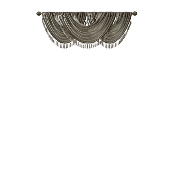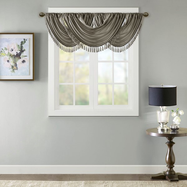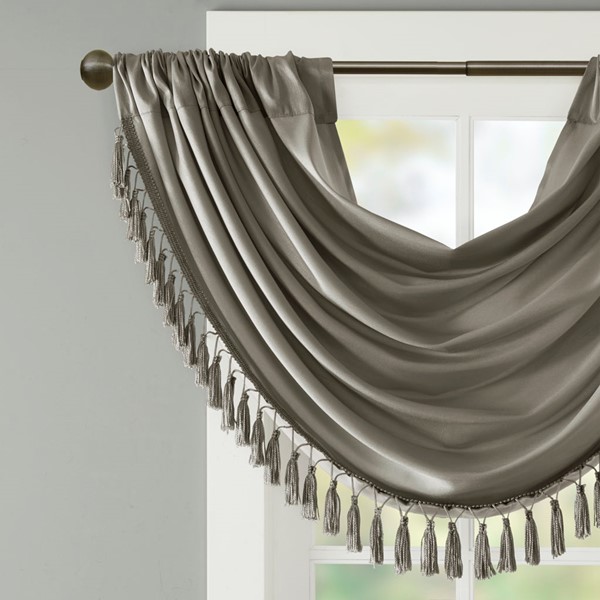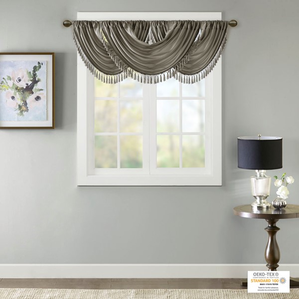 Bring style and sophistication to your windows, with our Elena Waterfall window valance. This classy charcoal valance showcases rich center draping details and a beautiful tassel trim, combined with the faux silk fabric for a rich sheen and stylish update. Features added lining and a rod pocket top finish; fits up to 1.25" diameter rod. Part of our decorative valance collection, this valance is perfect as a stylish addition to any small window or even better as a layering piece to dress up any window panel. This window valance is also OEKO-TEX certified, meaning it does not contain any harmful substances or chemicals, ensuring quality comfort and wellness. Need to purchase 3 valances to create same look as image.