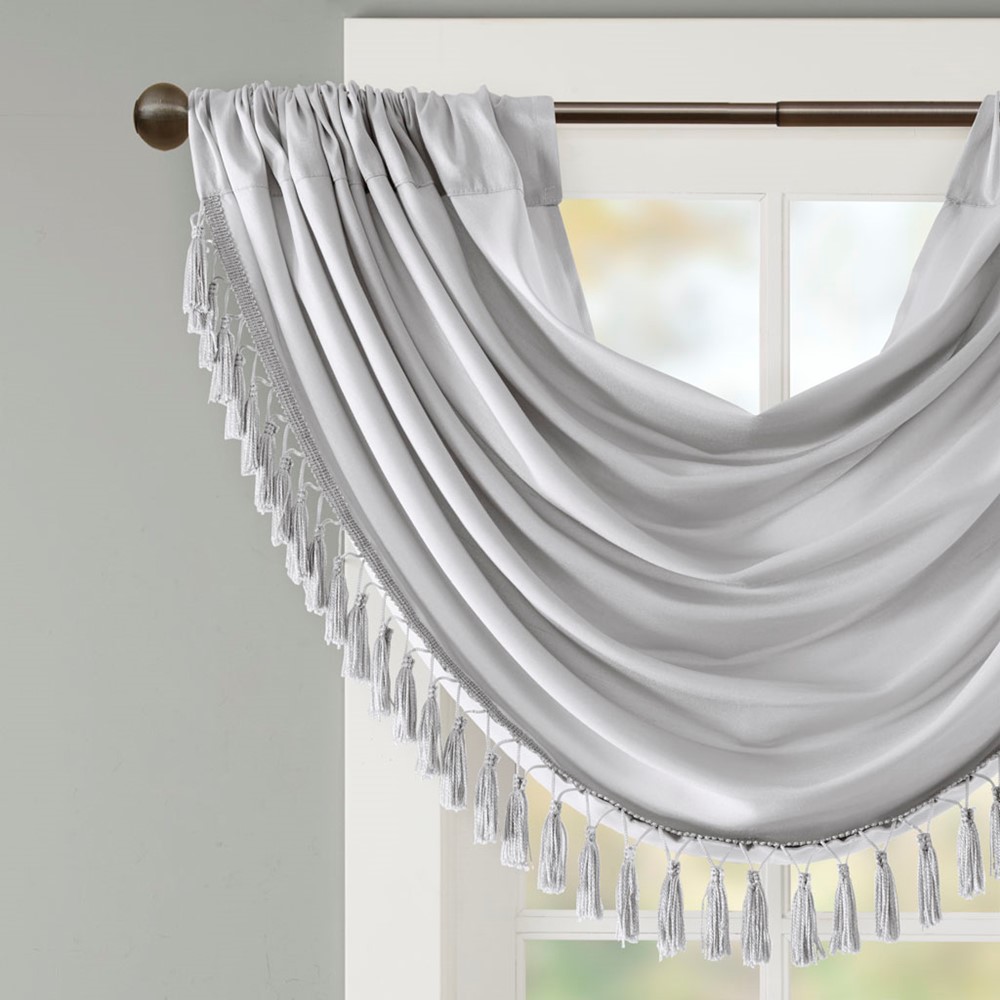 Bring style and sophistication to your windows, with our Elena Waterfall window valance. This classy silver valance showcases rich center draping details and a beautiful tassel trim, combined with the faux silk fabric for a rich sheen and stylish update. Features added lining and a rod pocket top finish; fits up to 1.25″ diameter rod. Part of our decorative valance collection, this valance is perfect as a stylish addition to any small window or even better as a layering piece to dress up any window panel. This window valance is also OEKO-TEX certified, meaning it does not contain any harmful substances or chemicals, ensuring quality comfort and wellness. Need to purchase 3 valances to create same look as image.