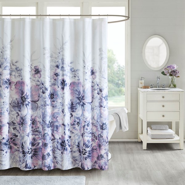 Our Madison Park Enza shower curtain introduces a beautiful splash of color and style to your bathroom space. A floral pattern in a purple watercolor print is printed on 100% cotton percale, bringing the perfect combination of vibrant color and natural appeal to your decor. Machine washable for easy care. Complete the collection with coordinate bedding, available and sold separately.