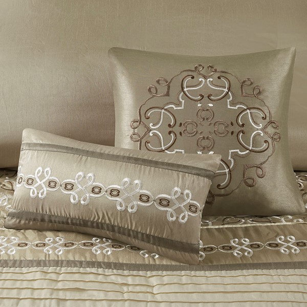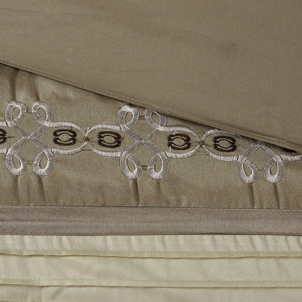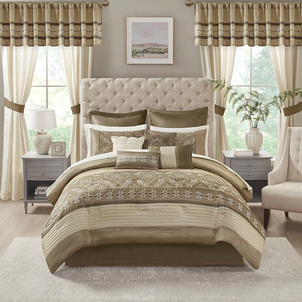 Update your entire space instantly with the Madison Park Essentials Jelena 24 Piece Room in a Bag. The bold taupe base on this comforter works beautifully with the soft natural piecing. Decorative embroidery adorns the bottom portion of this comforter and the center of each sham creating a rich look in your space. Four neutral window panels, four taupe tie backs and two embroidered valances accompany your new bedding for a whole room makeover. Four embroidered decorative pillows, two euro shams and a bedskirt put the finishing touches on this complete look. This bedding set may come in rolled or compressed packing and will need to be fluffed up. Use a steam iron to help remove wrinkles easier.