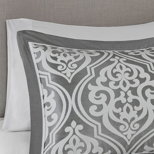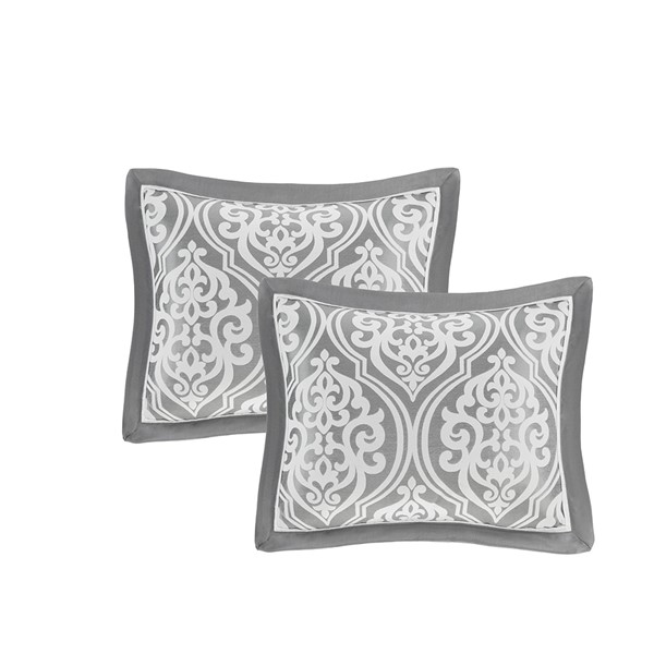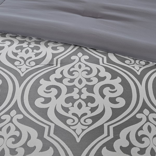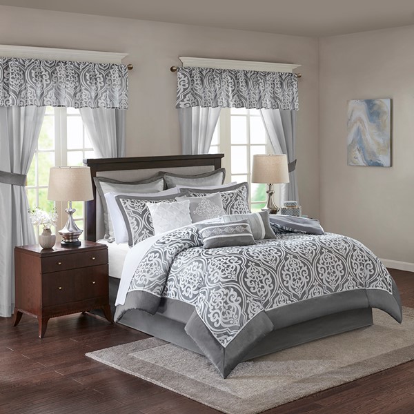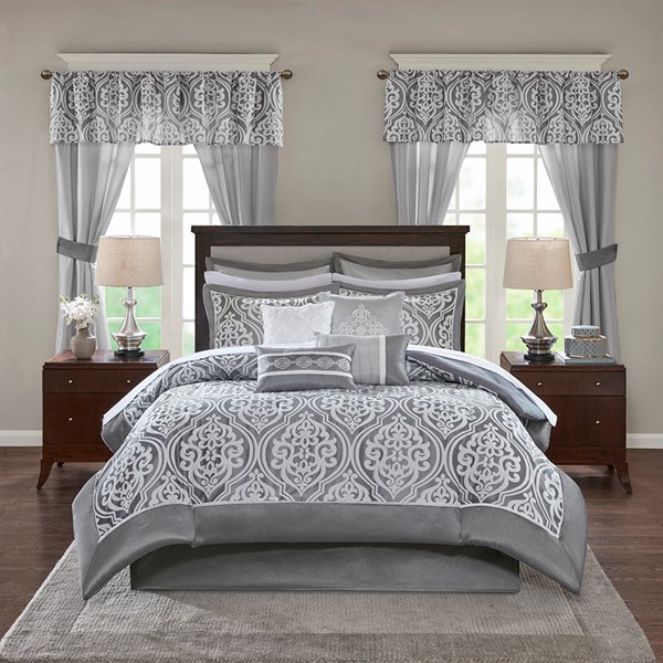 Update your entire bedroom all at once with the Madison Park Essentials Jordan 24 Piece Room in a Bag. The jacquard comforter creates a lavish look with its traditional ornate damask pattern and pieced design in rich hues. Coordinating shams reflect the motif seen on top of the bed, while luxurious Euro shams complement the handsome color scheme. Four decorative pillows with embroidered details and fabric manipulation techniques and a solid bed skirt provide the finishing touches to complete the collection. Also included are four solid window panels and two valances that allow you to create the perfect balance of style in your bedroom. Each window panel matches back to the bedding set and includes a tie-back to give a clean and crisp finish to your decor. Items in the set may come in a rolled or compressed packaging, which will need to be fluffed up or steam ironed before use to remove wrinkles.