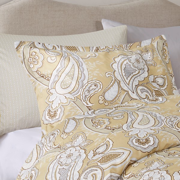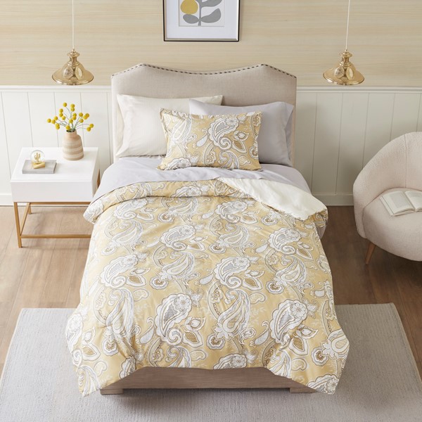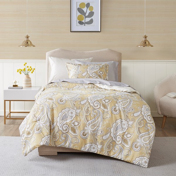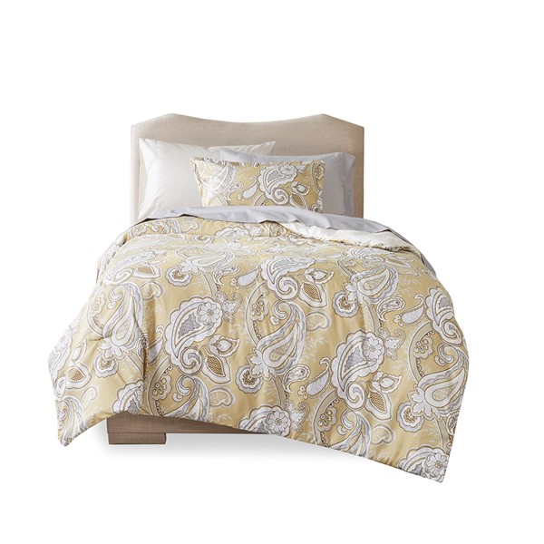 * Complete comforter and sheet set featuring a modern all over paisley print using a combination of wheat, grey, brown, and white colors