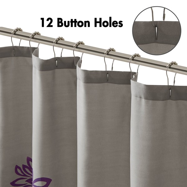 Transform your bathroom into a comfortably casual retreat with our Madison Park Essentials Maible Printed Floral Shower Curtain. This shower curtain features a beautiful printed floral design, in purple and white hues on a grey ultra-soft microfiber, for a fresh and lively touch to your decor. Measuring 72×72 inches and finished with 12 button holes at the top, this shower curtain is also machine washable for easy care. Complete the collection and look with coordinate bedding, available and sold separately.