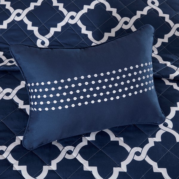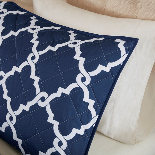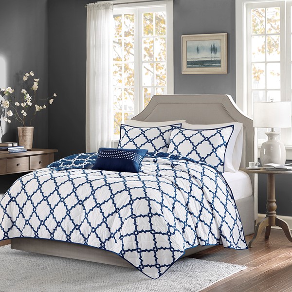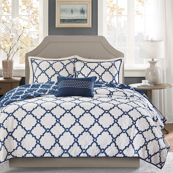 The Madison Park Essentials Merritt 4 Piece Reversible Quilt Set adds a simple yet chic look to your space. The quilt features a fretwork design against a vivid base that flips the color scheme on the reverse, for two distinct modern looks. Matching shams mirror the design on the face of the quilt, while an embroidered decorative pillow complete the bedding set. Bringing the best in health and wellness, this bedding set also features an anti-microbial treatment that provides built-in freshness protection, reducing the growth of odor causing bacteria and keeps fabric lasting longer. This bedding set is also OEKO-TEX certified, meaning it does not contain any harmful substances or chemicals, ensuring quality comfort and wellness. Items in the set may come in a rolled or compressed packaging, which will need to be fluffed up or steam ironed before use to remove wrinkles.