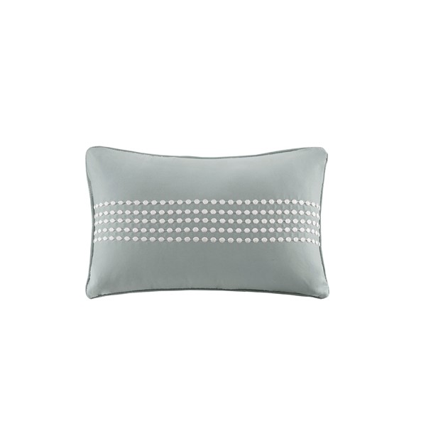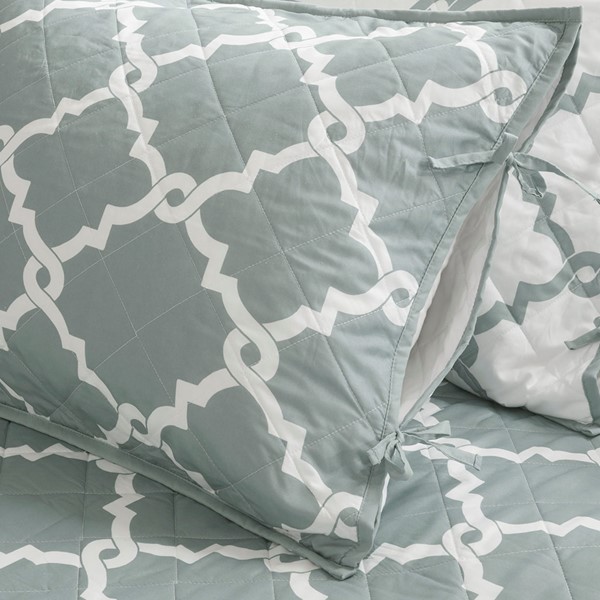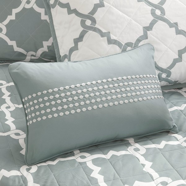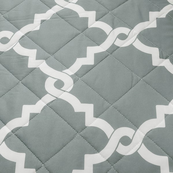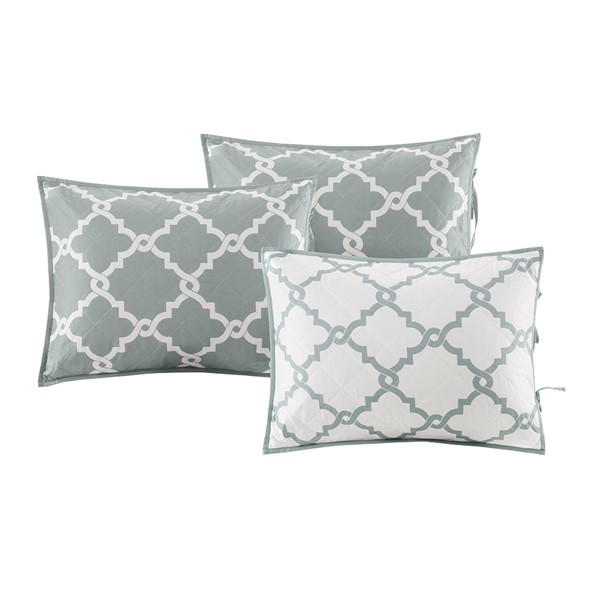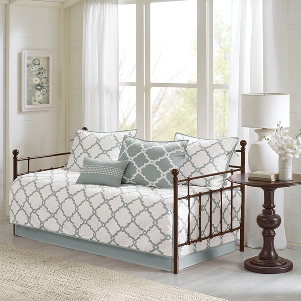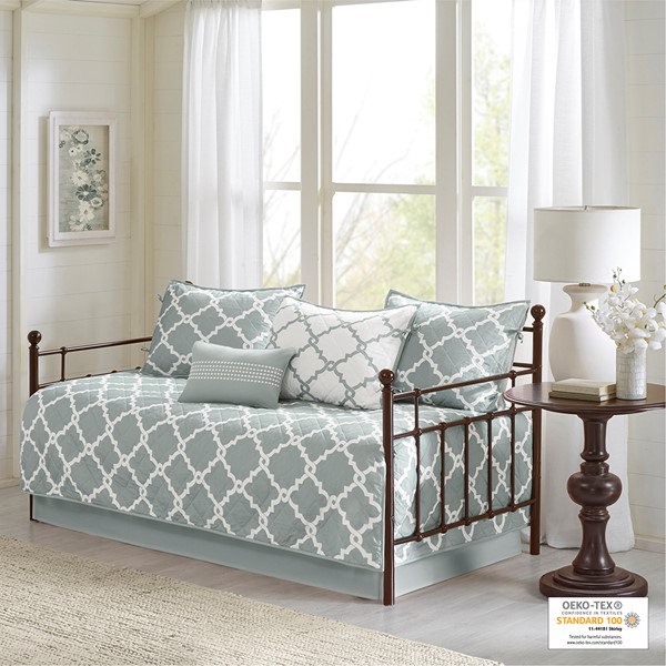 Create a simple yet chic look in your guest room with the Madison Park Essentials Merritt 6 Piece Reversible Daybed Set. This daybed cover features a fretwork design against a soft base that flips the color scheme on the reverse, for 2 distinct modern looks. The 3 matching reversible shams coordinate with the top of the bed and the reverse, while an embroidered decorative pillow and a solid bed skirt complete this daybed set. Bringing the best in health and wellness, this bedding set also features an anti-microbial treatment that provides built-in freshness protection, reducing the growth of odor causing bacteria and keeps fabric lasting longer. This bedding set is OEKO-TEX certified, meaning it does not contain any harmful substances or chemicals, ensuring quality comfort and wellness. Daybed cover fits a Twin size mattress.