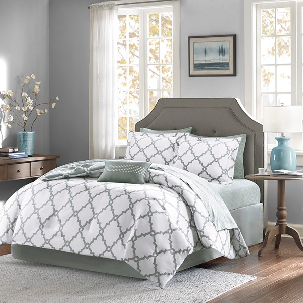 The Madison Park Essentials Merritt Reversible Complete Comforter and Cotton Sheet Set adds a simple yet chic look to your space. The comforter features a fretwork design against a vivid base that flips the color scheme on the reverse, for two distinct modern looks. Matching shams (1 in Twin Sizes) mirror the design on the face of the comforter, while an embroidered decorative pillow and solid bedskirt complete the bedding set. The included 100% cotton printed sheet set features a smaller scale fretwork pattern that complements the comforter. Bringing the best in health and wellness, this bedding set also features an anti-microbial treatment that provides built-in freshness protection, reducing the growth of odor causing bacteria and keeps fabric lasting longer. This bedding set is also OEKO-TEX certified, meaning it does not contain any harmful substances or chemicals, ensuring quality comfort and wellness. This bedding set may come in rolled or compressed packing and will need to be fluffed up. Use a steam iron to help remove wrinkles easier.