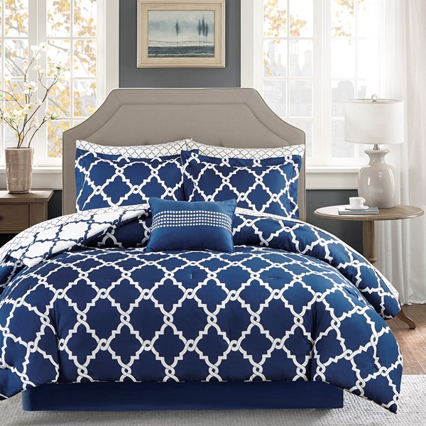 The Madison Park Essentials Merritt Reversible Complete Comforter and Cotton Sheet Set adds a simple yet chic look to your space. The comforter features a fretwork design against a vivid base that flips the color scheme on the reverse, for two distinct modern looks. Matching shams (1 in Twin Sizes) mirror the design on the face of the comforter, while an embroidered decorative pillow and solid bedskirt complete the bedding set. The included 100% cotton printed sheet set features a smaller scale fretwork pattern that complements the comforter. Bringing the best in health and wellness, this bedding set also features an anti-microbial treatment that provides built-in freshness protection, reducing the growth of odor causing bacteria and keeps fabric lasting longer. This bedding set is also OEKO-TEX certified, meaning it does not contain any harmful substances or chemicals, ensuring quality comfort and wellness. This bedding set may come in rolled or compressed packing and will need to be fluffed up. Use a steam iron to help remove wrinkles easier.