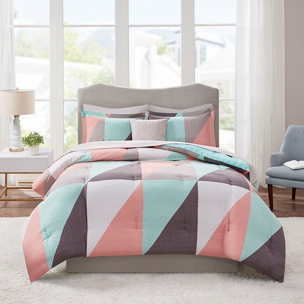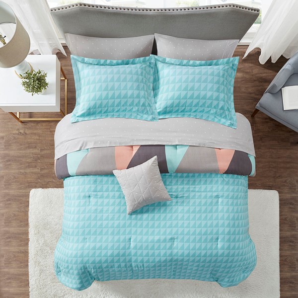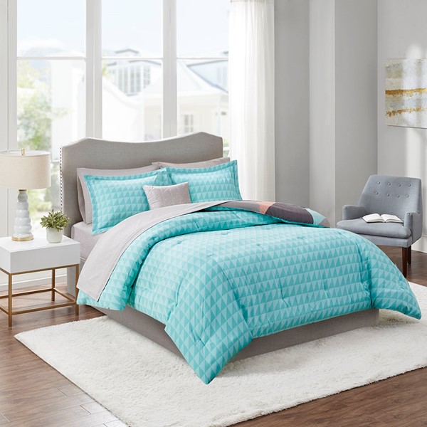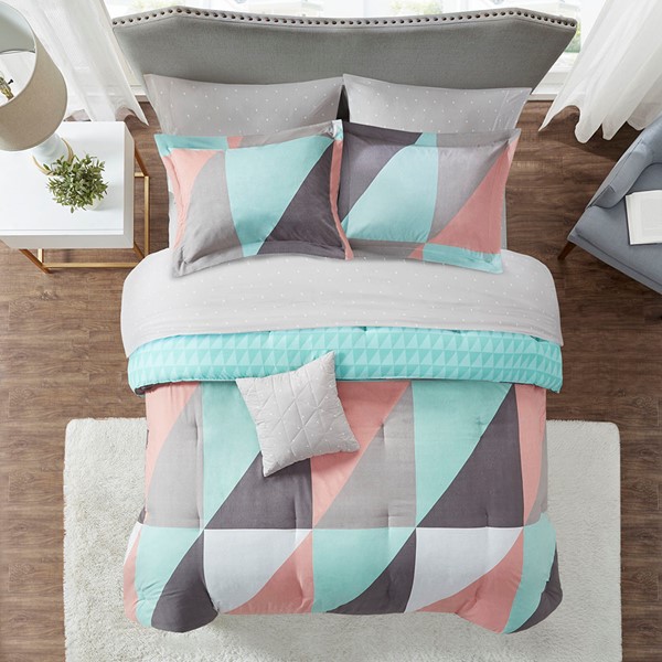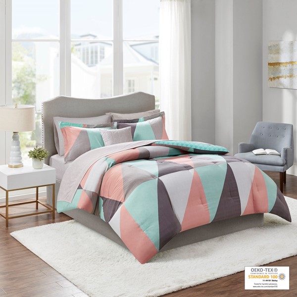 Brighten your bedroom with the modern style of the Madison Park Essentials Remy Reversible Complete Bed Set. The reversible comforter features a large multi-color triangle pattern that flips to a small aqua triangle print on the reverse, for two contemporary looks. Two matching reversible shams (1 in Twin Sizes) pair perfectly with the comforter, while a grey decorative pillow adds the finishing touch. Also included is a grey micro-fiber sheet set with small white triangles that complements the comforter. Bringing the best in health and wellness, this bedding set also features an anti-microbial treatment that provides built-in freshness protection, reducing the growth of odor causing bacteria and keeps fabric lasting longer. This bedding set is also OEKO-TEX certified, meaning it does not contain any harmful substances or chemicals, ensuring quality comfort and wellness.