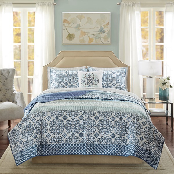 Madison Park Essentials Sybil Quilt Set with Cotton Bed Sheets in Blue, King MPE13-511