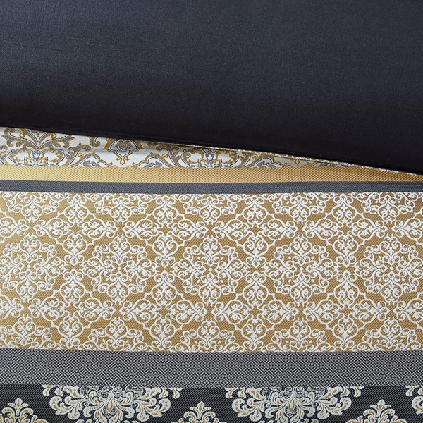 Completely transform your bedroom with the Madison Park Essentials Windsor 24 Piece Room in a Bag. The jacquard comforter and shams flaunt a chain-link design in rich black and gold hues that create an elegant contrast. Coordinating black Euro shams and a solid black bed skirt with a 15-inch drop complement the top of the bed with a bold touch. Four decorative pillows with hypoallergenic filling and embroidered details provide the finishing touches to the jacquard bedding set. A complete microfiber sheet set, including a fitted sheet that fits up to a 16-inch mattress depth, flat sheet, and two pillowcases, adds a super soft touch to your bed. Also included are four window curtains with four tiebacks and two valances that coordinate with the jacquard bedding set to complete your bedroom decor. Luxurious and elegant, this 24 piece room in a bag provides everything you need to redecorate your bedroom. This bedding set may come in rolled or compressed packing and will need to be fluffed up. Use a steam iron to help remove wrinkles easier.