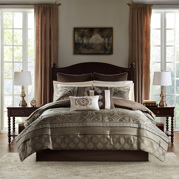 The Madison Park Essentials Zara 16 Piece Jacquard Complete Bedding Set with 2 Sheet Sets offers a luxurious traditional update for your bedroom. An elegant jacquard design, in shades of brown, adorns the face on the comforter and a solid dark brown reverse complements the top of the bed. Two shams and two dark brown Euro shams perfectly complement the comforter, while three decorative pillows with embroidery and pintuck details and a solid brown bedskirt provide the finishing touches. Also included are two complete sheet sets with fitted sheets that fit up to 16-inch mattress depth. One sheet set showcases a medallion print and the other is a solid brown that coordinate back to the jacquard bedding set. Bringing the best in health and wellness, this bedding set also features an anti-microbial treatment that provides built-in freshness protection, reducing the growth of odor causing bacteria and keeps fabric lasting longer. Filled with hypoallergenic filling in the comforter and decorative pillows, this jacquard complete bedding set transforms your entire bedroom with its traditional style and is machine washable for easy care. This bedding set may come in rolled or compressed packing and will need to be fluffed up. Use a steam iron to help remove wrinkles easier.
