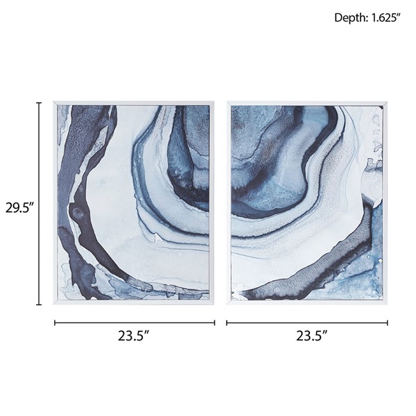 Crisp and serene, the Madison Park Ethereal Diptych 2-piece Framed Canvas Wall Art Set by Artist Megan Swartz, provides a fresh and modern update to your decor. An abstract design, in light and dark shades of blue, spills across the canvas to create an icy cool contrast, while the white frame detailing adds a clean finish. A gel coat provides additional texture and a light glossy touch to this piece, while also preventing fading over time. Sold as a two piece set, each piece meausuring 23.5×29.5″ and featuring 2 D-rings on the reverse, easily hang this set together for a larger focus piece or separately throughout your home for a cool touch to fit any space. With its contemporary style and frame detailing, this printed canvas wall art brings a stylish and gallery look to your living room or bedroom.