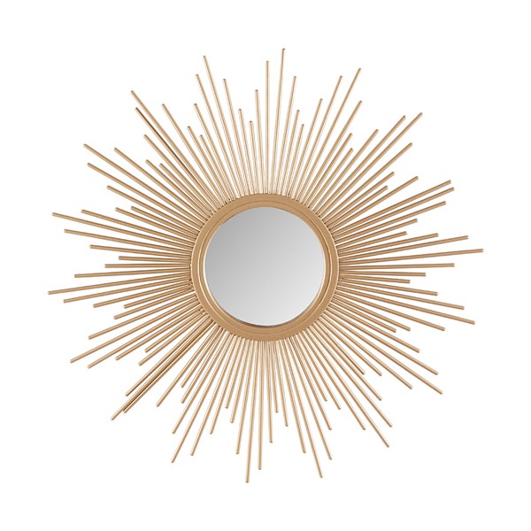 Add a modern and glamorous touch to your space with our Madison Park Sunburst Mirror. A stylized iron frame is featured in a sphere design creating beautiful dimension, while the gold foil adds a rich sheen and luster. The keyhole hanger feature on the reverse of the mirror allows for effortless hanging on your wall. Incorporate this wall mirror into your decor, for the perfect combination of chic luxe and metallic flair. Mirror is sold as a single piece and does not come as a set; for the complete look purchase other size for a stylized cluster or hang individually as a focus piece. The larger piece measures 29.5" with 8"D mirror size, while the smaller piece measures 14.5" with 3.875"D mirror size. Handle with care; Gently wipe clean with a damp cloth
