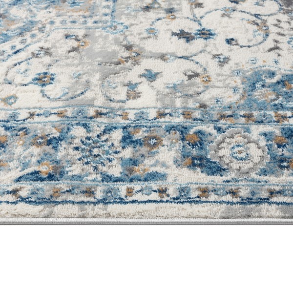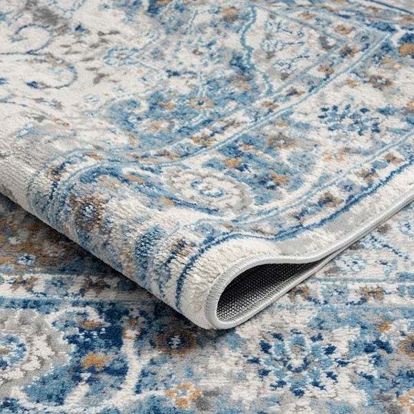 The Madison Park Frances Medallion Woven Area Rug offers a beautiful traditional update to your home decor. Made in Turkey, this machine woven area rug features a medallion pattern in shades of light blue to create a globally inspired look. The soft, medium pile makes the woven rug well suited for high traffic areas, while the transparent sprayed latex reverse helps keep the rug from sliding. A rug pad is still highly recommended to keep the rug in place. Stain and fade resistant, this woven area rug is OEKO-TEX certified, meaning it does not contain any harmful substances or chemicals to ensure quality comfort and wellness. Rug is available in multiple sizes, which makes it perfect for your living room, family room, or entryways. Clean with a vacuum or by spot cleaning.