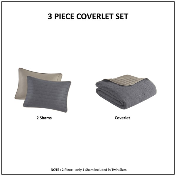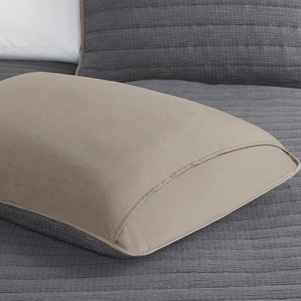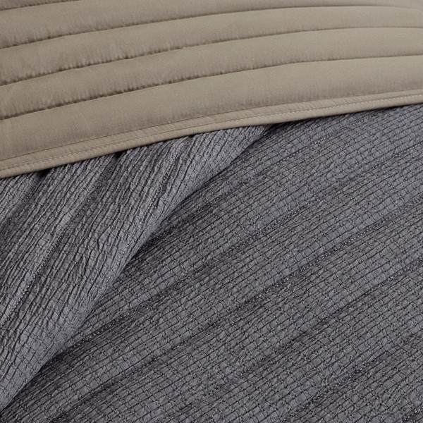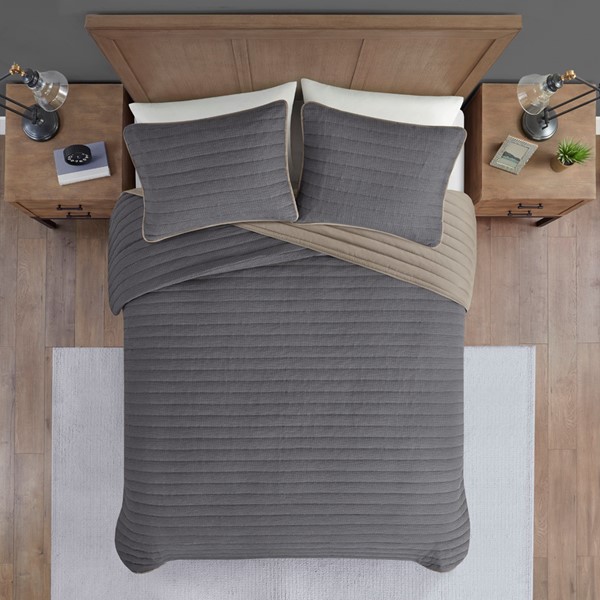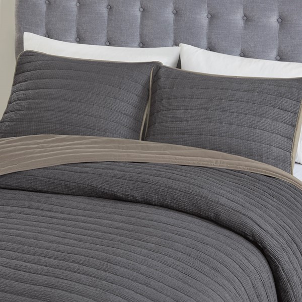 Introduce a casual comfort and easily coordinating style to your bedroom with this reversible quilt set. A crinkled fabric design, in a gray color, creates texture and dimension to give this farmhouse quilt set a casual look and relaxing vibe. The solid taupe reverse features channel stitching to complement the quilt’s color and style, making it easy to pair either side with your bedroom decor. With 2 matching shams included, this reversible quilt set is perfect by itself or as a layering piece for added style and warmth on those colder nights.