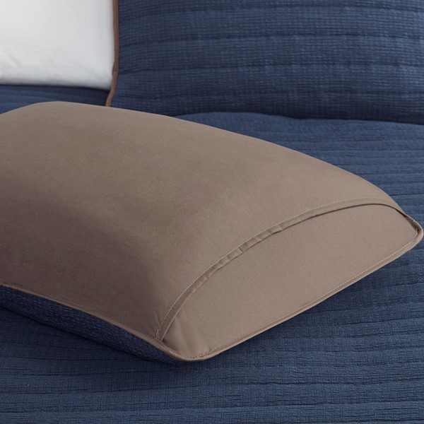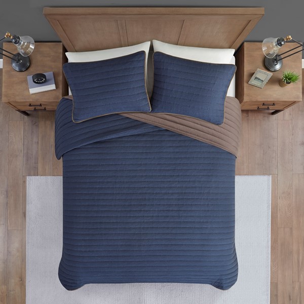 Introduce a casual comfort and easily coordinating style to your bedroom with this reversible quilt set. A crinkled fabric design, in a navy color, creates texture and dimension to give this farmhouse quilt set a casual look and relaxing vibe. The solid brown reverse features channel stitching to complement the quilt’s color and style, making it easy to pair either side with your bedroom decor. With 2 matching shams included, this reversible quilt set is perfect by itself or as a layering piece for added style and warmth on those colder nights.