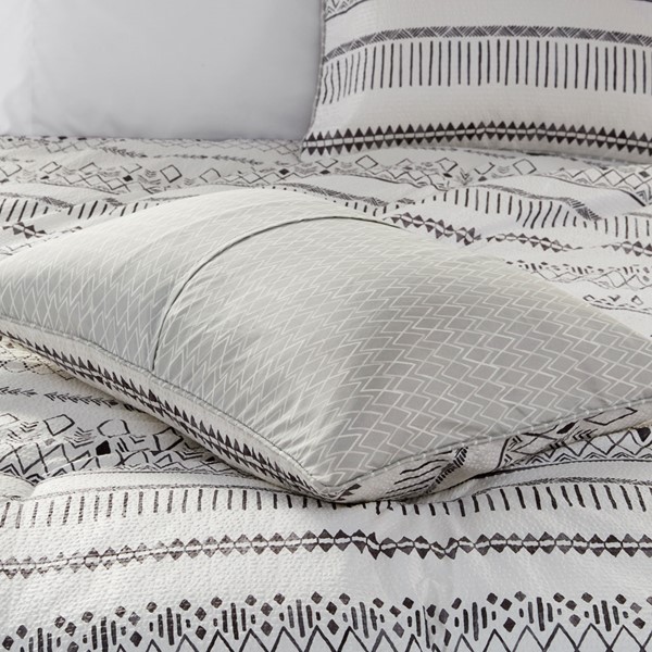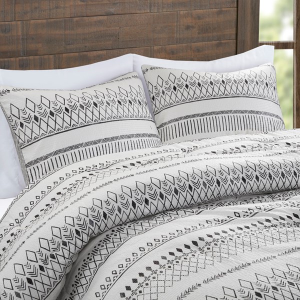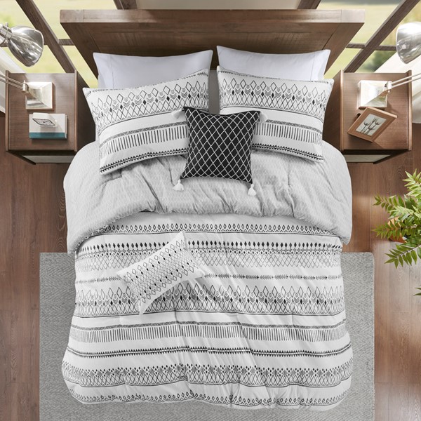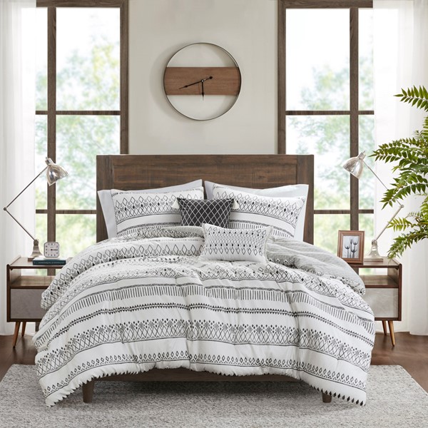 Soft and lightweight, the Madison Park Fraser comforter set brings a Southwest inspired touch to your bed. A diamond print in soft black adorns the light ivory face, while a grey diamond print on the reverse adds a complementary farmhouse look. This set includes a comforter, 2 shams, and 2 decorative pillows with tassels or fringe to tie back into the bedding. This reversible comforter also features an antimicrobial treatment to help reduce the growth of odor causing bacteria and keep the fabric lasting longer. This set is machine washable in a large capacity commercial washer/dryer for best care.