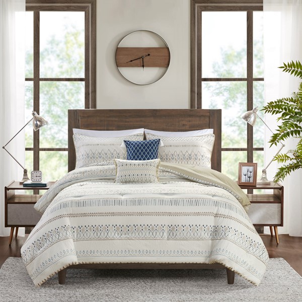 Soft and lightweight, the Madison Park Fraser comforter set brings a Southwest inspired touch to your bed. A diamond print in soft blue and taupe colors adorns the light beige face, while a taupe diamond print on the reverse adds a complementary farmhouse look. This set includes a comforter, 2 shams, and 2 decorative pillows with tassels or fringe to tie back into the bedding. This reversible comforter also features an antimicrobial treatment to help reduce the growth of odor causing bacteria and keep the fabric lasting longer. This set is machine washable in a large capacity commercial washer/dryer for best care.