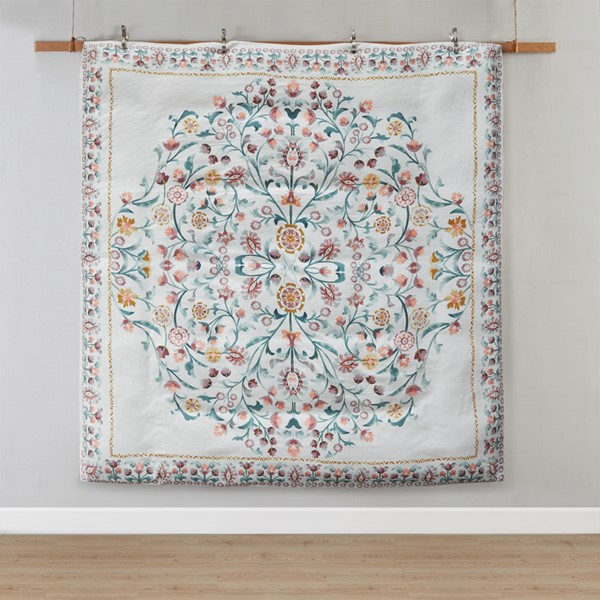 This shabby chic comforter set features a large floral print design in the center while blossoms line the edges of the comforter creating an enchanting border. Included with this set is one square decorative pillow with tufted pom poms for a touch of whimsical delight. Colors found in this bed set include various shades of teal, blue, pink, blush, and tan to create this gorgeous floral design. The comforter is overfilled to ensure a lofty and comfortable sleeping experience. This bedding set is machine washable and has a 100% polyester filling that is dustproof and hypoallergenic. It is OEKO-Tex certified and very durable for lasting comfort.