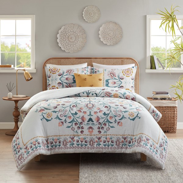 * Shabby Chic giant medallion floral print with botanical flowers along the comforter edge border (double border in King/Cal King size)
