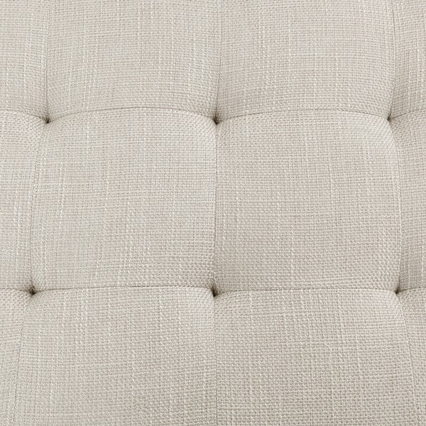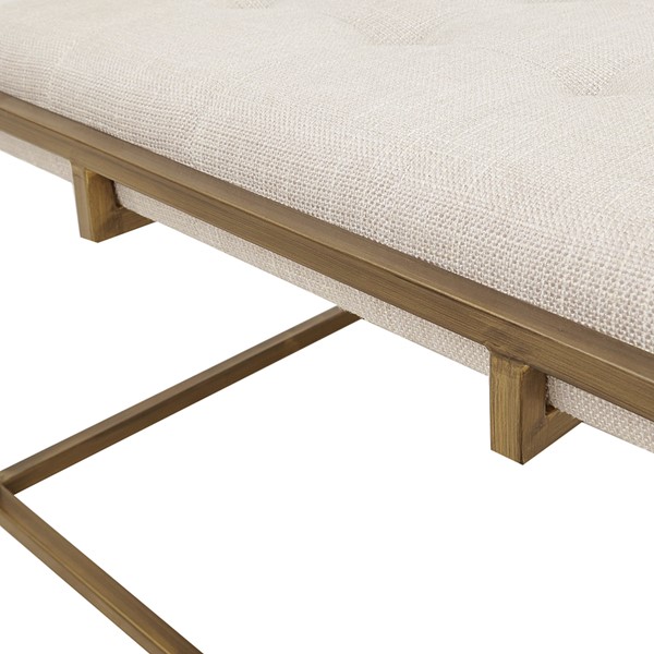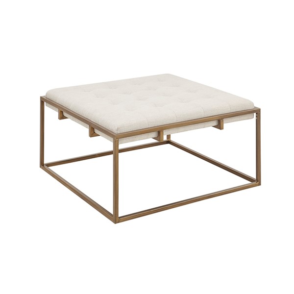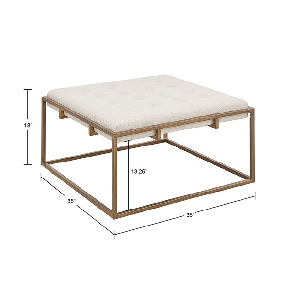 Elevate your living room decor with the elegance of the Madison Park Greenwich Ottoman/Coffee Table. This square ottoman is upholstered in a rich ivory fabric and features a tufted top that adds a sophisticated touch to the modern look. An antique bronze finish on the metal frame beautifully contrasts the upholstery, completing the contemporary design. Simple, yet elegant, this upholstered ottoman serves as the perfect focal point to your living space. Some assembly required.