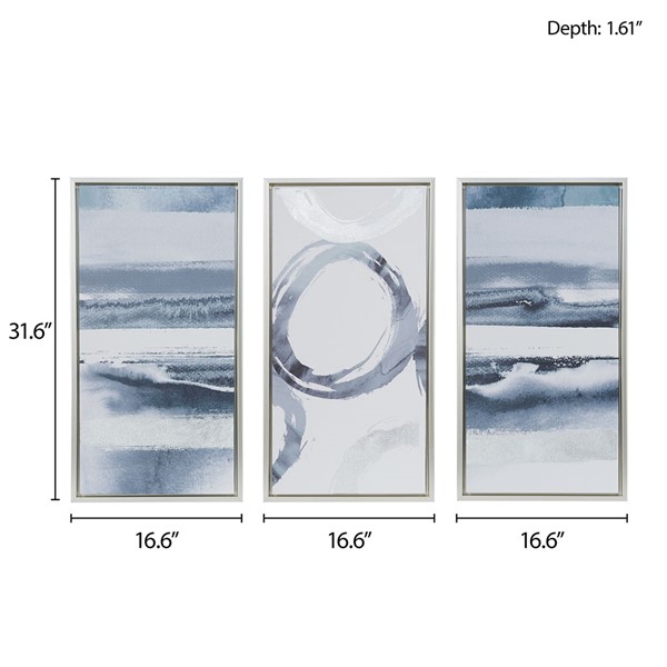 Update your space with the modern flair of our Madison Park Grey Surrounding Silver Foil Abstract 3-piece Framed Canvas Wall Art Set by Artist Evangeline Taylor. This wall art set flaunts an abstract pattern in striking hues of grey, white, and silver that create a subtle contrast, while the silver foil embellishment adds a metallic luster for beautiful texture and dimension. A gel coating provides a glossy touch and prevents the colors from fading over time, while the silver frame adds the finishing touch for a contemporary update to this masterpiece. Featuring 2 D-rings on the reverse of each piece, simply hang this set together for a large focus art piece or separately throughout your home to fit any space. Comes as a 3 piece set, each piece measures 16.6×31.6" and is spot clean only.