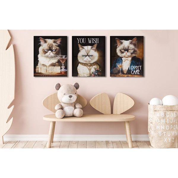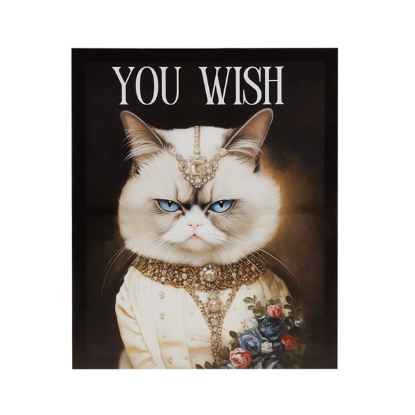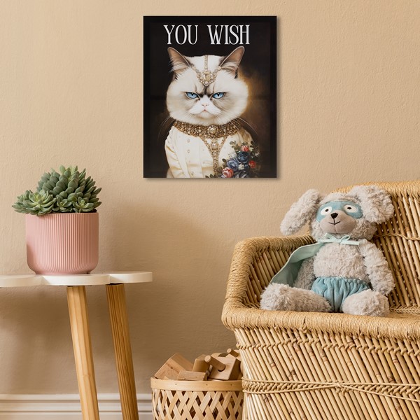 Add a dose of humor and charm to your living space with Tessa Kane’s grumpy cat art. This canvas, featuring the witty ‘You Wish’ quip, goes beyond typical wall decor–it’s a daily source of amusement. Effortlessly hang it with the pre-installed sawtooth hanger, and keep it looking its best with spot cleaning. Created for indoor use, it infuses your home decor with a unique and lighthearted touch. Embrace the feline attitude and let this artwork bring daily laughter and character to your surroundings. Ideal for cat lovers and those who enjoy a touch of wit in their decor, it’s a delightful addition to any space, adding cheer and a hint of irreverence throughout your home