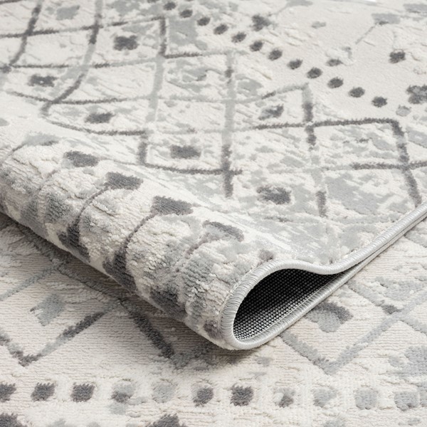 Add a fashionable style to your living space with the Madison Park Hannah Moroccan Area Rug. This machine woven, cut area rug features a light grey and cream globally inspired print creating a rich and beautiful, look and feel. The medium soft pile provides simple comfort, as a transparent sprayed latex reverse helps to prevent rug from sliding making it well suited to high-traffic areas in your home. Easy to clean with a vacuum or spot cleaning, while also stain and fade resistant – this area rug brings a splash of color and a textural element to any home decor. This woven area rug is OEKO-TEX certified, meaning it does not contain any harmful substances or chemicals to ensure quality comfort and wellness. Available in multiple colors and sizes, this rug is perfect for any living room, family room, and or other room decor. A rug pad is highly recommended to keep the rug more secured in place; Rug pad sold separately.